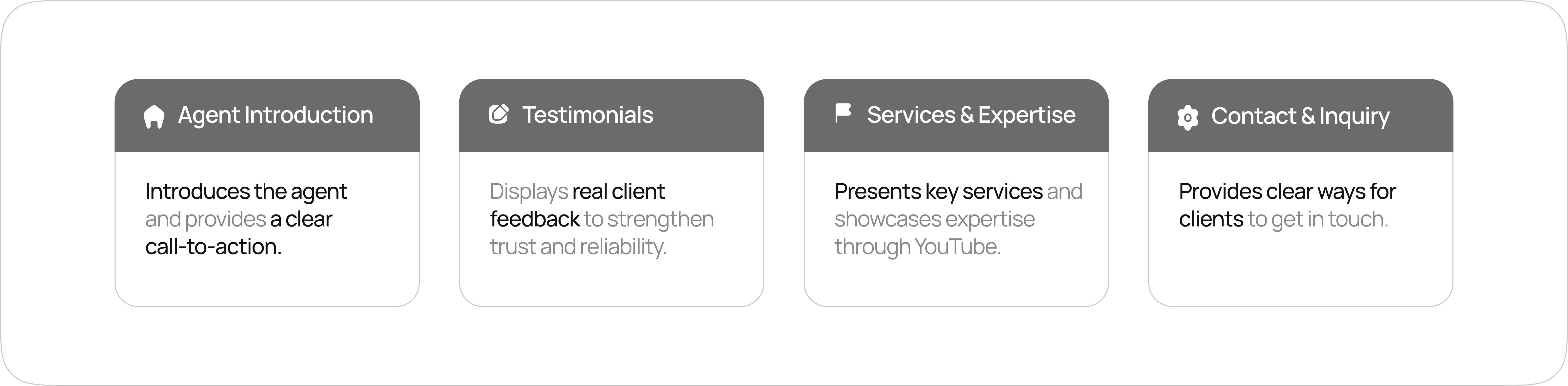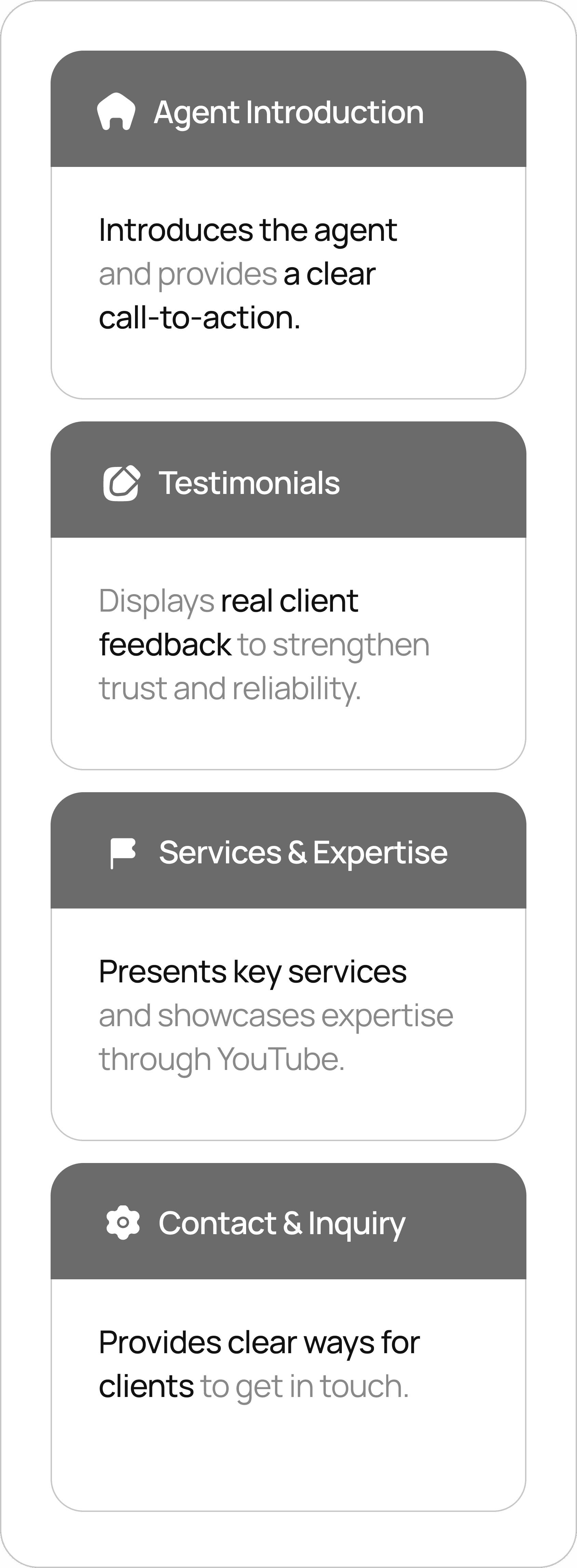 Since the website consisted of only one page, the challenge was structuring information so users could quickly understand the agent’s services and feel encouraged to contact them.